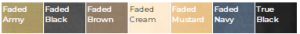 Faded Army, Faded Black, Faded Brown, Faded Cream, Faded Mustard, Faded Navy, Faded Black
