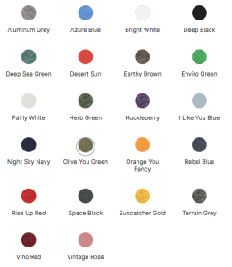 | Color | Aluminum Grey, Azure Blue, Bright White, Deep Black, Deep Sea Green, Desert Sun, Earthy Brown, Enviro Green, Fairly White, Herb Green, Huckleberry, I Like You Blue, Night Sky Navy, Olive You Green, Orange You Fancy, Rebel Blue, Rise Up Red, Space Black, Suncatcher Gold, Terrain Grey, Vino Red |