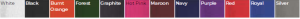 White, Black, Burnt Orange, Forest, Graphite, Hot Pink, Maroon, Navy, Purple, Red, Royal, Silver