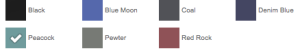 Black, Royal Moon, Coal, Denim Blue, Peacock, Pewter, Red Rock