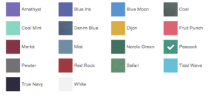 | Color | Amethyst, Blue Ice, Blue Moon, Coal, Cool Mint, Denim Blue, Dijon, Fruit Punch, Merlot, Mist, Nordic Green, Peacock, Pewter, Red Rock, Safari, Tidal Wave, True Navy, White |