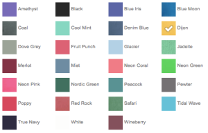 | Color | Amethyst, Black, Blue Iris, Blue Moon, Coal, Cool Mint, Denim Blue, Dijon, Dove Grey, Fruit Punch, Glacier, Jadeite, Merlot, Mist, Neon Coral, Neon Green, Neon Pink, Nordic Green, Peacock, Pewter, Poppy, Red Rock, Safari, Tidal wave, True Navy, White, Wineberry |