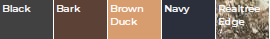 Black, Bark, Brown Duck, Navy, Realtree Edge