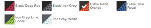 | Color | Black/Deep Red, Black /Iron Grey, Black/Neon Orange, Black/True Royal, Iron Grey/Lime Shock, Iron Grey/White |