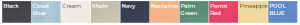 Black, Cloud Blue, Cream, Khaki, Navy, Nectarine, Palm Green, Parrot Red, Pineapple, Pool Blue