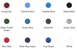 | Color | Burgundy, Carolina Blue, Coastal Blue, Deep Black, Deep Forest Green, Dusty Blue, Graphite, Gusty Grey, Rich Red, River Blue Navy, True Royal, White |
