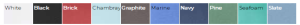 White, Black, Brick, Chambray, Graphite, Marine, Navy, Pine, Seafoam, Slate
