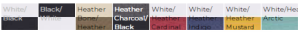 White/Black, Black/White, Heather Bone/Heather Army, Heather Charcoal/Black, White/Heather Cardinal, White/Heather Indigo, White/Heather Mustard, White/Heather Arctic