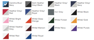 | Color | Carolina Blue/Navy, Dark Heather Grey/Black, Heather Grey/Black, Heather Grey/Navy, Heather Grey/Red, Heather Grey/Royal, White/Black, White/Bright Pink, White/Deep Orange, White/Forest, White/Gold, White/Heather Grey, White/Maroon, White/Navy, White/Purple, White/Red, White/Royal |