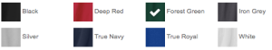 | Color | Black, Deep Red, Forest Green, Iron Grey, Silver, True Navy, True Royal, White |