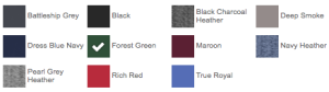 | Color | Battleship Grey, Black, Black Charcoal Heather, Deep Smoke, Dress Blue Navy, Forest Green, Maroon, Navy Heather, Pearl Grey Heather, Rich Red, True Royal |