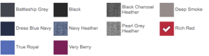 | Color | Battleship Grey, Black, Black Charcoal Heather, Deep Smoke, Dress Blue Navy, Navy Heather, Pearl Grey Heather, Rich Red, True Royal, Very Berry |