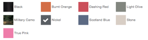 Black, Burnt Orange, Military Camo, Chocolate Brown, Dashing Red, Light Olive, Nickel, Scotland Blue, Stone, True Pink
