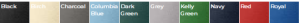 Black, Birch, Charcoal, Columbia Blue, Dark Green, Grey, Kelly Green, Navy, Red, Royal