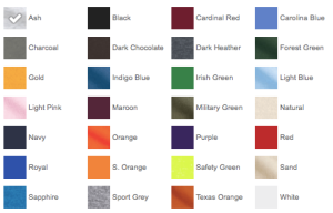 | Color | White, Black, Ash, Cardinal Red, Carolina Blue, Charcoal, Dark Chocolate, Dark Heather, Forest Green, Gold, Indigo Blue, Irish Green, Light Blue, Light Pink, Maroon, Military Green, Natural, Navy, Orange, Purple, Red, Royal, Safety Green, Safety Orange, Sand, Sapphire, Sport Grey, Texas Orange |