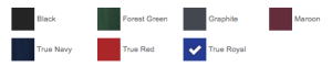 | Color | Black, Forest Green, Graphite, Maroon, True Navy, True Red, True Royal |