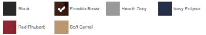 | Color | Black, Fireside Brown, Heather Grey, Navy Eclipse, Red Rhubarb, Soft Caramel |