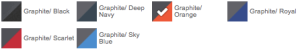 | Color | Graphite/Black, Graphite/Deep Navy, Graphite/Orange, Graphite/Royal, Graphite/Scarlet, Graphite/Bay Blue |