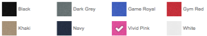 Black, Dark grey, Game Royal, Gym Red, Khaki, Navy, Vivid Pink, White