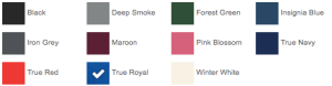 Black, Deep Smoke, Forest Green, Insignia Blue, Iron Grey, Maroon, Pink Blossom, True Navy, True Red, True Royal, Winter White