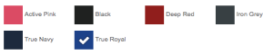 Active Pink, Black, Deep Red, Iron Grey, True Navy, True Royal
