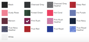 | Color | Black, Charcoal Grey, Charcoal Grey Heather, Deep Red, Dusty Rose, Forest Green, Hot Coral, Iris Purple, Maroon, Pink Rush, Pink Rush Heather, True Navy, True Navy Heather, True Red, True Royal, True Royal Heather, White |