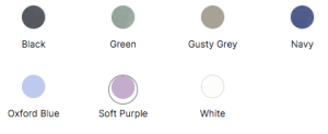 | Color | Black, Green, Gusty Grey, Navy, Oxford Blue, Soft Purple, White |
