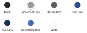 Black, Monument Grey, Sterling Grey, True Blue, True Navy, Ultramarine Blue, White