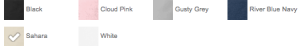 Black, Cloud Pink, Gusty Grey, River Blue Navy, Sahara, White